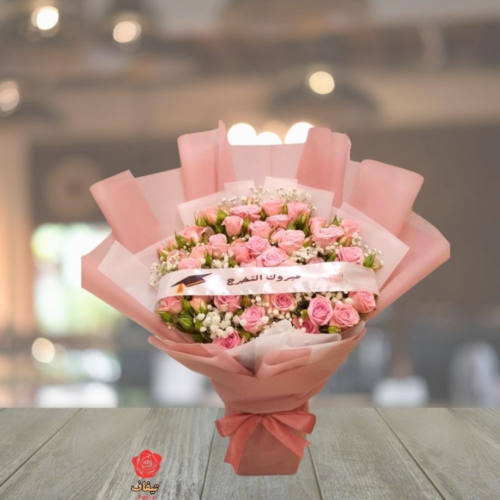 تنسيق أنيق يفيض بنعومة اللون الوردي وتفاصيل الجيبسوفيلا البيضاء، مغلف بورق فاخر وشريط “مبروك التخرج” ليجسّد الفرح والفخر بلحظة الإنجاز.